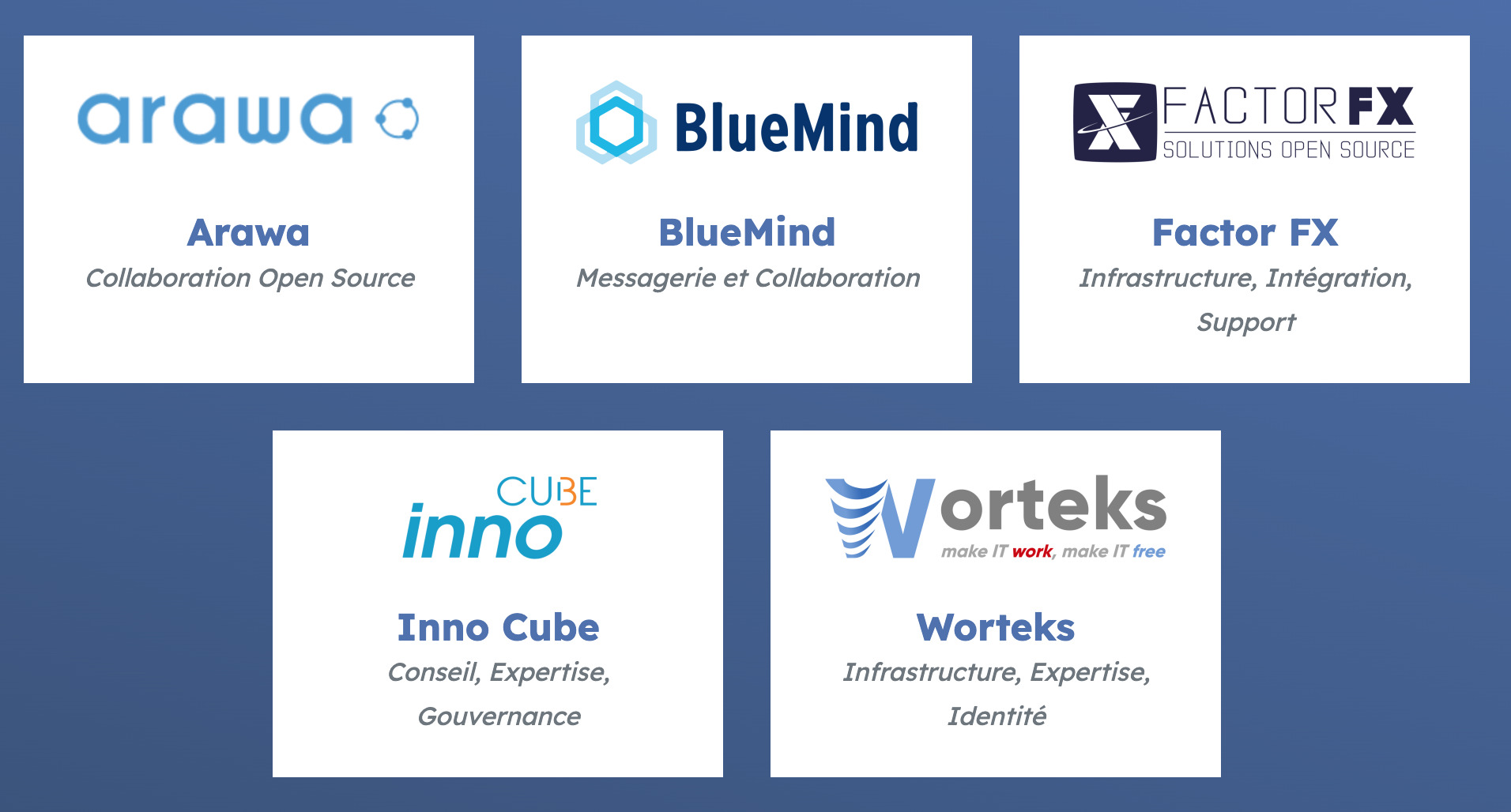 Arawa, BlueMind, FactorFX, Inno3 et Worteks ont créé la société OSE afin de permettre l’accès à l’expertise open source disséminée chez de nombreux acteurs spécialisés, souvent petits et de proposer un guichet unique pour répondre aux besoins des donneurs d’ordre.