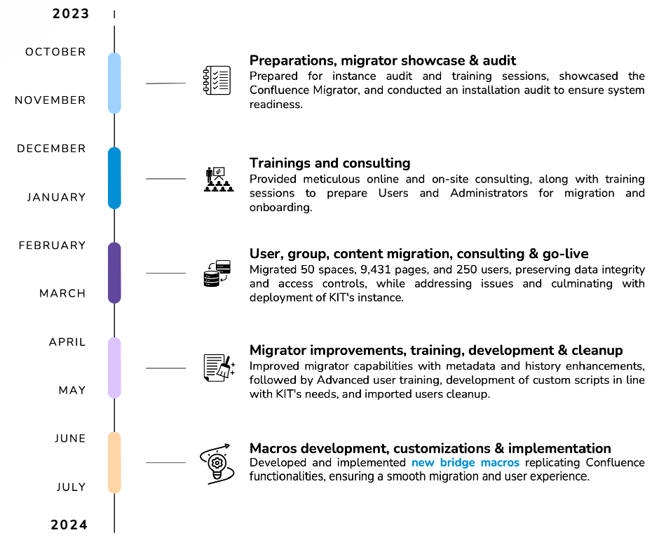 The entire consulting, planning, migration and customization process was completed within 6 months, resulting in a highly tailored intranet and documentation system that met all of KIT’s stringent requirements. The migration was realized with the help of XWiki’s Confluence Migrator (Pro), which facilitated an efficient and accurate transition of data, including 50 spaces, 9431 pages, 250 users, and their permissions.