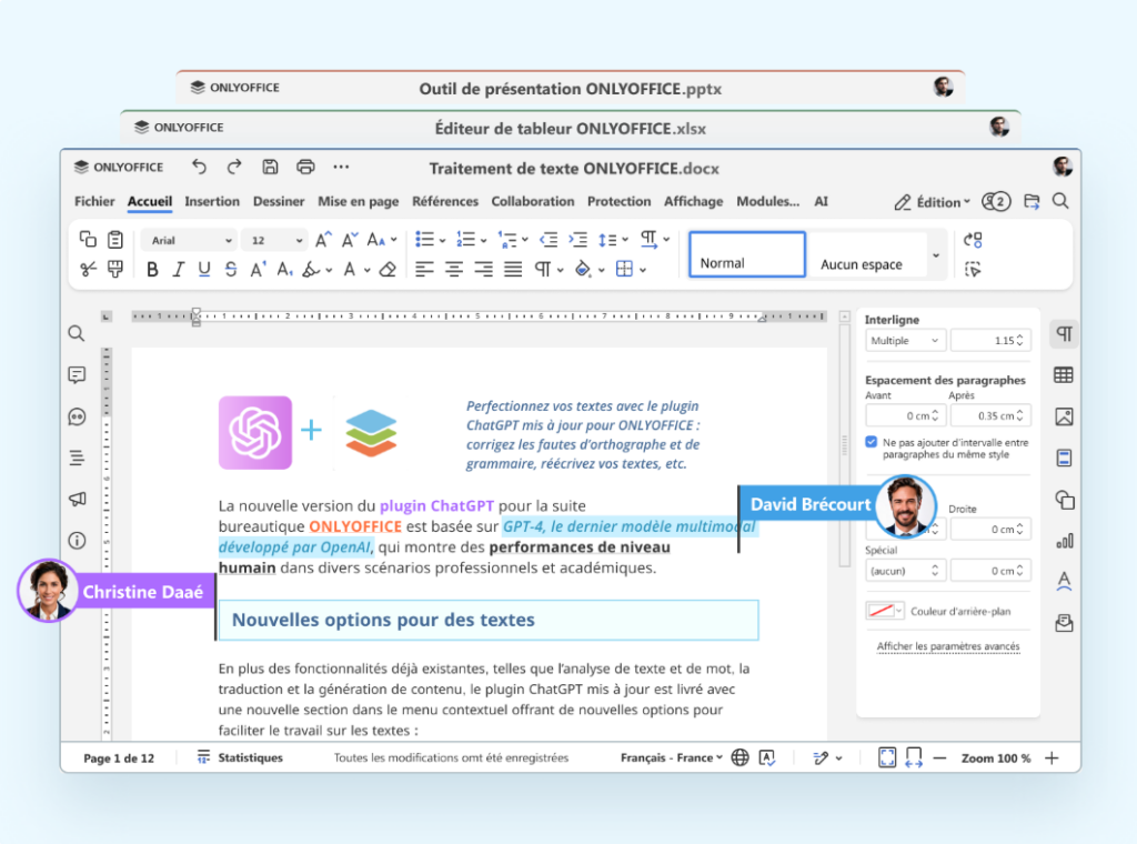 ONLYOFFICE supports all standard formats (DOCX, XLSX, PPTX, PDF, ODT, etc.) and offers flexible deployment (cloud, on-premises or private), as well as seamless integration with Nextcloud, ownCloud, Moodle, Odoo, SharePoint, Confluence, and many others.