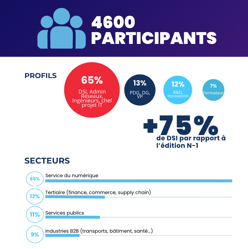 Rencontrez plus de 4 000 professionnels porteurs de projets ciblés et issus de sociétés du numérique, d’entreprises de développement, administratrices systèmes & réseaux ou de sociétés expertises technologiques… de professions SI aux directions digitales, innovation et métiers. Une audience à la découverte des dernières tendances en matière d’innovation et à la recherche de nouveaux partenariats technologiques.