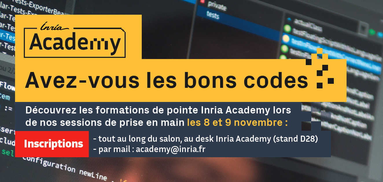 Découvrez les formations Inria Academy lors des sessions de prise en main des logiciels Inria, les 8 et 9 novembre. Inscriptions tout au long du salon, au desk Inria Academy (stand D28), ou par mail : academy@inria.fr. Pensez à apporter votre ordinateur portable.