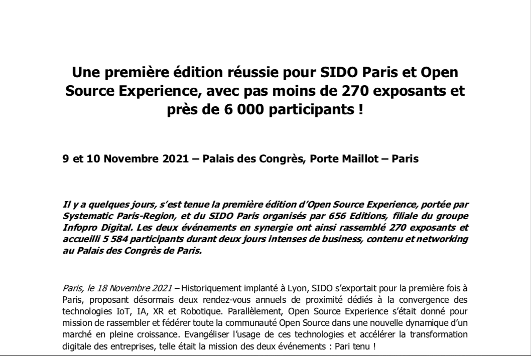 656 Editions, filiale d’Infopro digital et organisateur du SIDO, annonce le lancement d’un nouvel événement dédié aux technologies Open Source : OPEN SOURCE EXPERIENCE. Il se tiendra conjointement à la première édition parisienne du salon SIDO, les 9 et 10 novembre prochains au Palais des Congrès de Paris. 70 exposants et 150 conférences rythmeront les deux jours de l’événement.