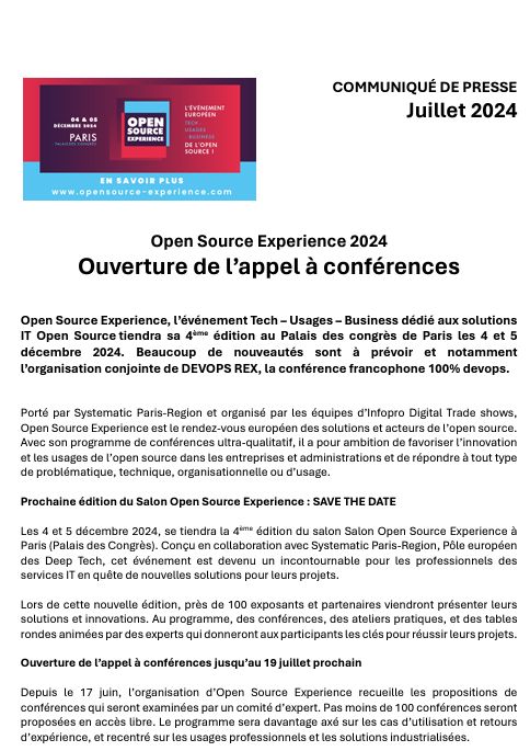 Open Source Experience, l’événement Tech – Usages – Business dédié aux solutions IT Open Source tiendra sa 4ème édition au Palais des congrès de Paris les 4 et 5 décembre 2024. L’appel à conférences vient d’être lancé et les soumissions seront possibles jusqu’au 19 juillet. Beaucoup de nouveautés sont à prévoir et notamment l’organisation conjointe de devops Rex, la conférence francophone 100% Devops.