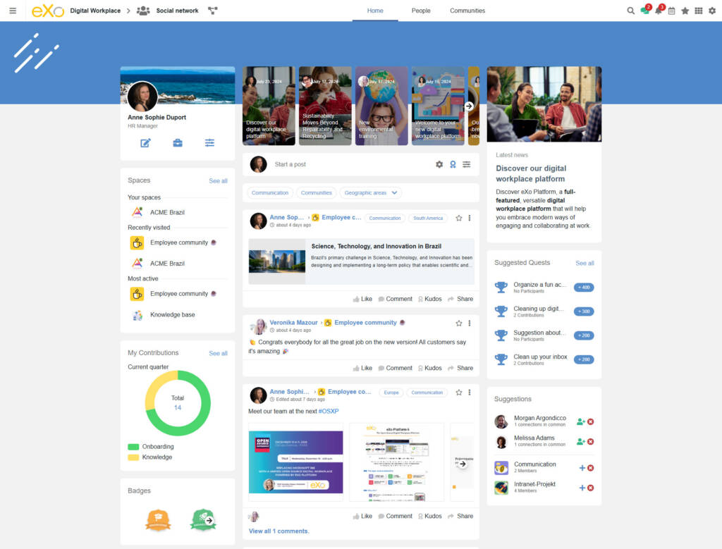 Disponible on premise ou dans le cloud (privé & SecNumCloud), eXo est une digital workplace tout-en-un, ergonomique, no code et mobile, qui s’adapte à tous vos cas d’usages : intranet moderne, plateforme collaborative, réseau social, portail collaborateur…