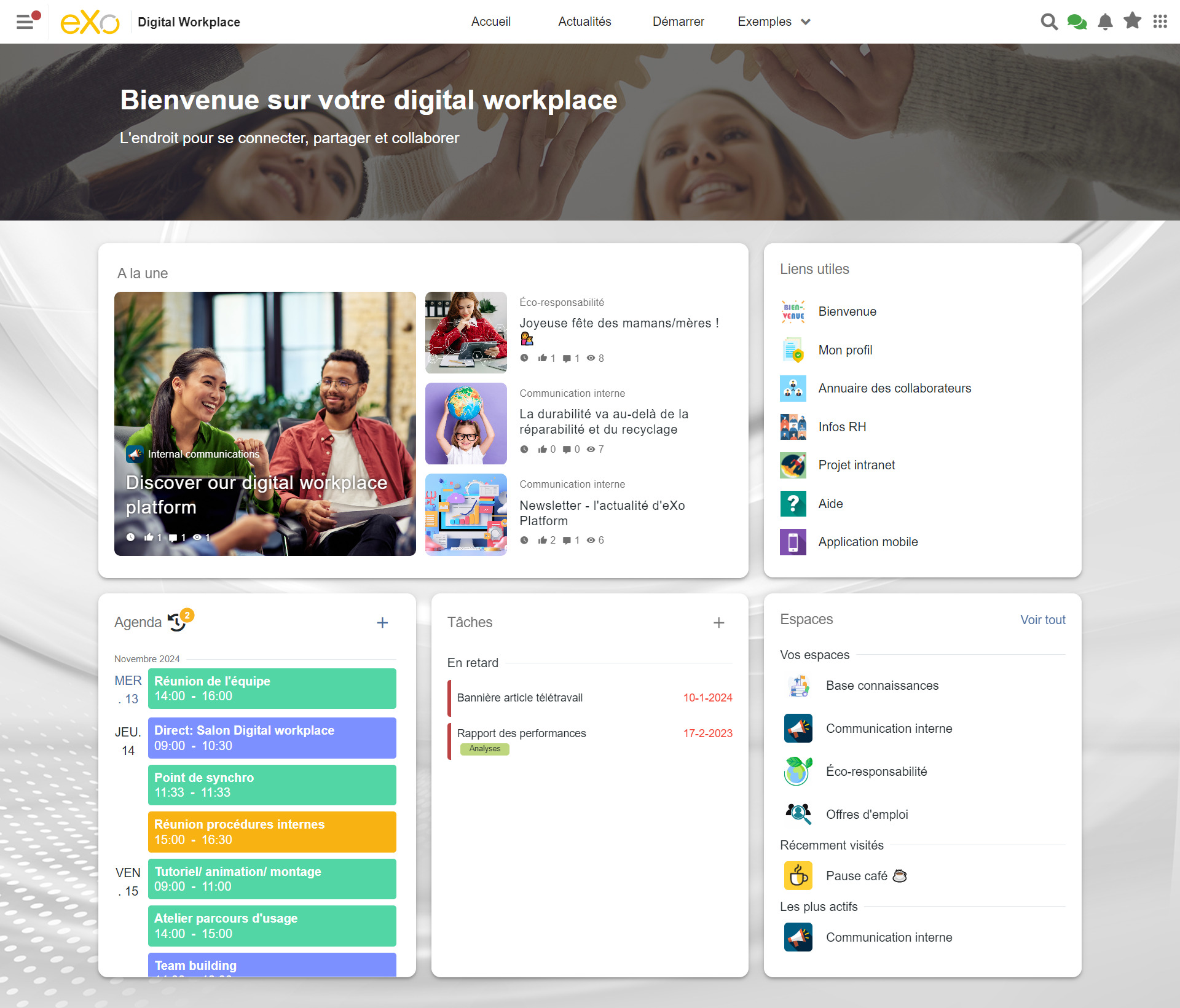 Éditeur français de logiciels open-source depuis plus de 20 ans, eXo Platform est un spécialiste des solutions intranet et digital workplace. eXo accompagne ses clients dans leur transformation digitale en leur offrant une plateforme ergonomique, complète, sécurisée et souveraine au service de l’expérience collaborateur.