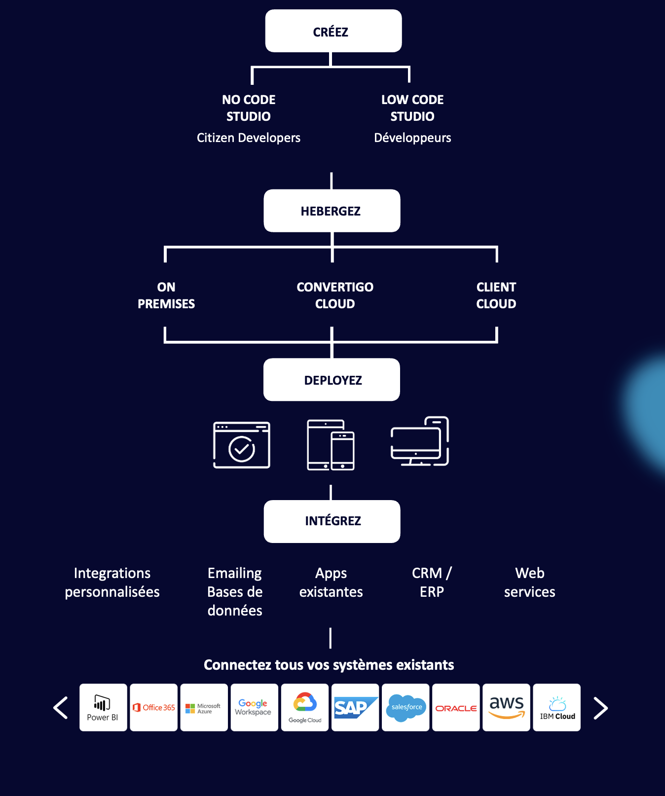 Un développement unique permet de générer des applications web, mobiles, desktop et Progressive Web Apps (PWA), avec une intégration fluide à tous les systèmes d’information existants, même les plus complexes (SAP, AS400, Office 365…).